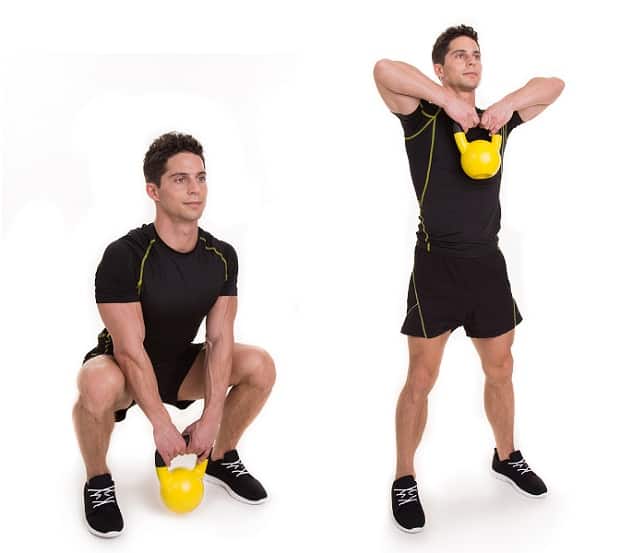 Когда колени полностью выпрямляются, начинаем тянуть гирю по направлению к подбородку. Основные работающие мышечные группы при этом – дельтовидные мышцы (особенно, передний пучок) и трапеции. Небольшая часть нагрузки также приходится на бицепсы и предплечья.
