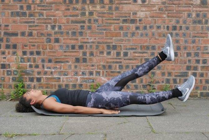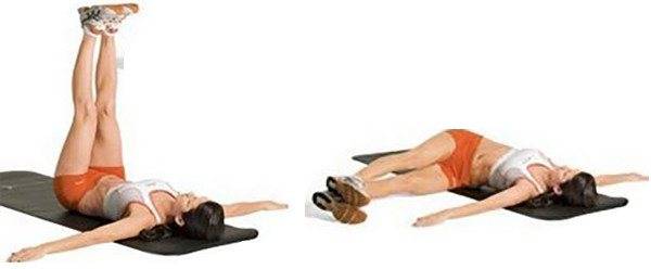 - С втянутым животом конечности поднимают вертикально пятками к потолку.