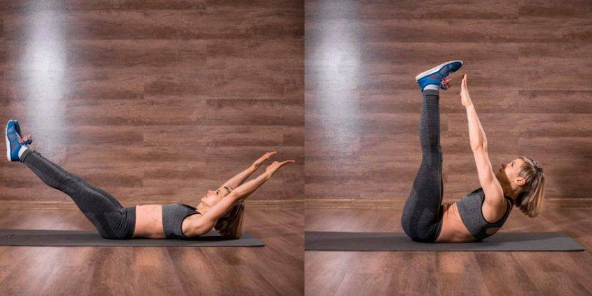 - Одновременно с движение ног выполняйте скручивание, отрывая лопатки от пола. Руки сведите вместе и тянитесь ими к носкам.