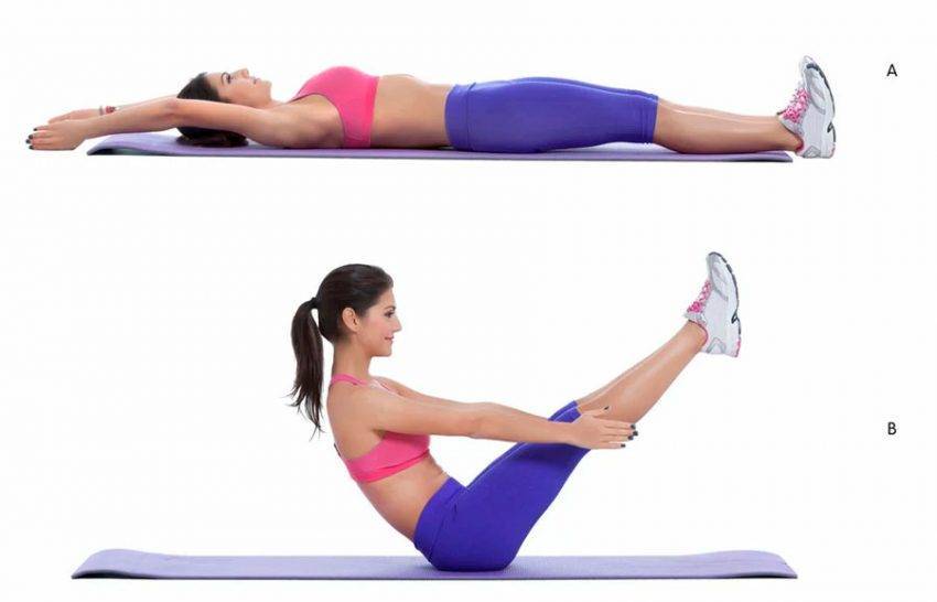 На выдохе поднимите верх корпуса, потянитесь ладонями вдоль пола вперед, выпрямите ноги вверх. Корпус плотно прижат к полу и стабилизирован, лопатки не касаются коврика. На вдохе вернитесь в исходное положение.