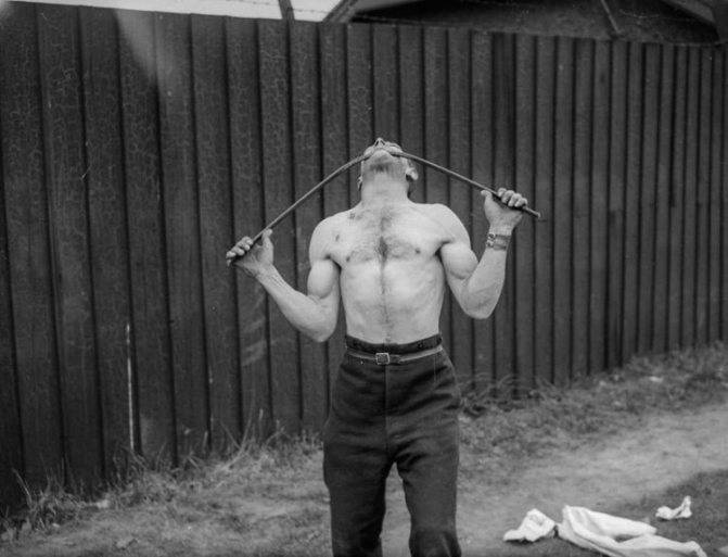 1925 год. Греческий боксер и силач Джаст Лессис демонстрирует свое мастерство, сгибая железный прут вокруг шеи.