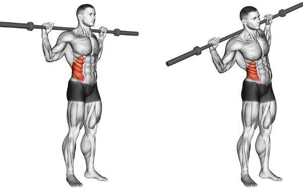 Во время задания нельзя наклоняться вперед или назад. Чтобы увеличить нагрузку, можно разместить свободную руку за головой. В качестве снаряда можно использовать гриф. С этим инструментом выполняются наклоны.