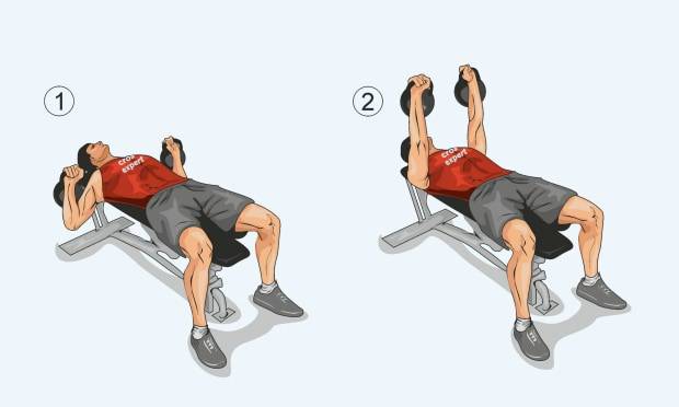 - Исходное положение (ИП) – лежа, лопатки сведены, ноги надежно упираются в пол. Руки с гирями выпрямлены и находятся над грудью. Хват – за ручки, снаряды свисают не по бокам, а в сторону головы.