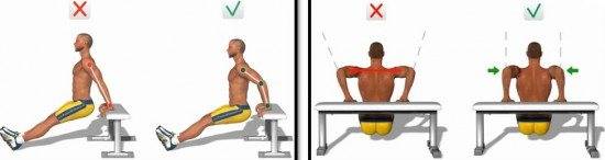 Отжимания на брусьях и от скамьи имеют одну биомеханику, поэтому не надо выполнять их в один тренировочный день, иначе мышцы перегрузятся. Также не опирайтесь на мягкую поверхность руками, иначе придется постоянно отвлекаться на правильное положение рук.