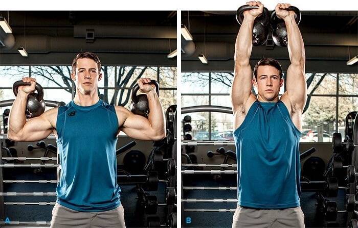 Гантели можно заменить на гири. В этом случае, нужно стартовать от уровня плеч, но ладони должны быть направлены друг к другу. В процессе движения вверх происходит разворот снарядов как в жиме Арнольда. Некоторые атлеты жмут изначально ладонями вперед, но такая позиция достаточно травмоопасна для запястий.