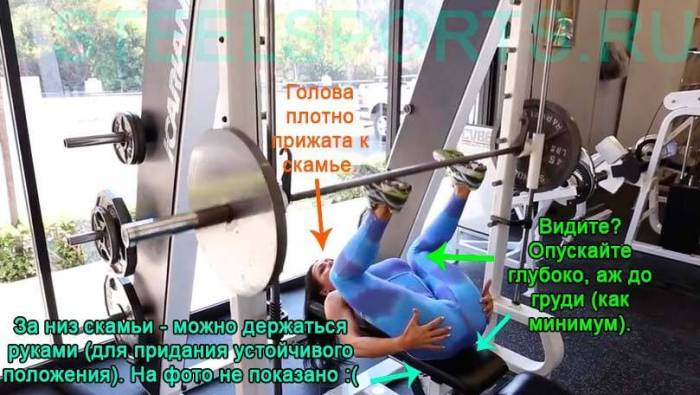 Важно держать корпус тела прямо, не отклоняясь сильно назад, иначе создать нормальную опору для выполнения упражнения не получится. Допустимо лишь небольшое отклонение назад при подъеме штанги вверх