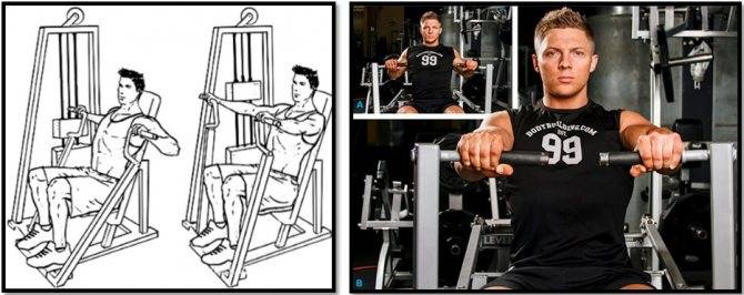 Исходное положение – сидя в тренажере. Высоту сидения подбираем так, чтобы верхняя часть груди находилась немного выше рукояток тренажера. Возьмитесь за ручки широким прямым хватом, локти держите все время направленными в стороны, если есть ножной рычаг, нажмите его: